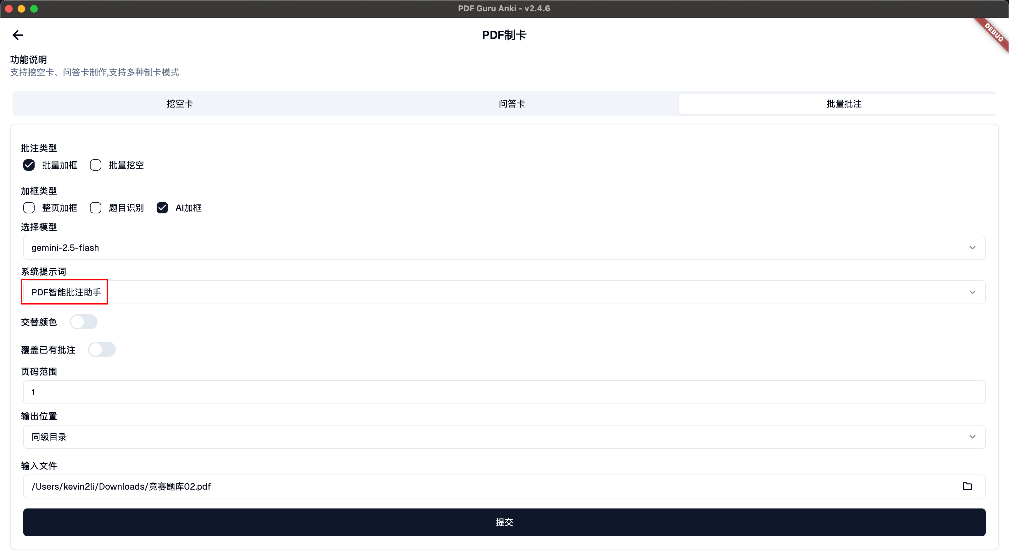 使用此功能前建议先掌握AI制卡的用法。需要先在AI制卡中配置好模型参数和提示词,本软件已经内置了一套“PDF智能批注助手“提示词,一般情况下可直接使用。